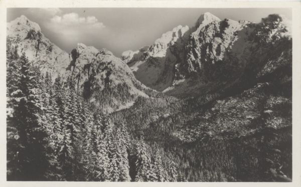 Zimowy widok z Siodełka na Dolinę Małej Zimnej Wody. Z lewej Pośrednia Grań, z prawej Łomnica.