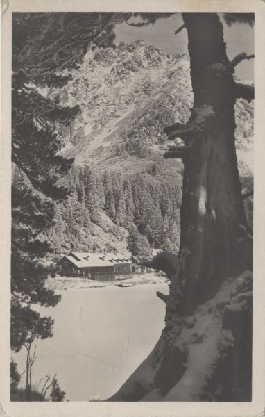 Schronisko nad Popradzkim Stawem w zimowej scenerii. W tle Kopa Popradzka.