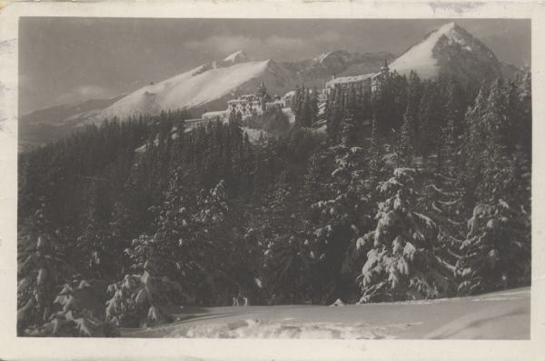 Szczyrbskie Jezioro. Hotele Mori w zimowej scenerii. W tle: Krywań, Siodełkowa Kopa, Ostra i Wielkie Solisko.