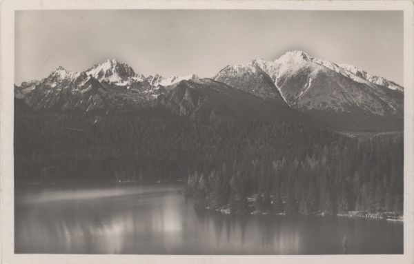 Widok na Szczyrbskie Jezioro i otaczające go lasy. W tle pokryte śniegiem wierzchołki szczytów - od lewej: Kopa Popradzka, Wysoka, Tępa i Kończysta. Z przodu Osterwa.