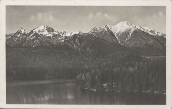 Widok na Szczyrbskie Jezioro i otaczające go lasy. W tle pokryte śniegiem wierzchołki szczytów - od lewej: Kopa Popradzka, Wysoka, Tępa i Kończysta. Z przodu Osterwa.
