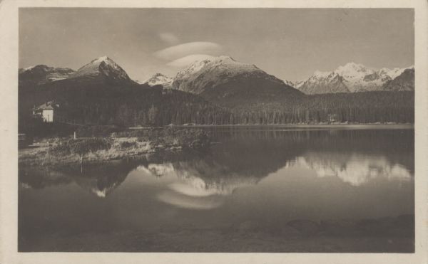 Widok Szczyrbskiego Jeziora z odbijającymi się wodzie ośnieżonymi szczytami. Od lewej: Szczyrbskie Solisko, Szczyrbski Szczyt, Skrajna Baszta, Kopa Popradzka i Wysoka. Na brzegu jeziora willa Marina.