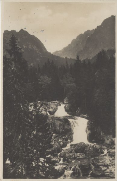 Tatry Wysokie. Wodospad w Dolinie Zimnej Wody. Tytuł również w języku: niem., węg.