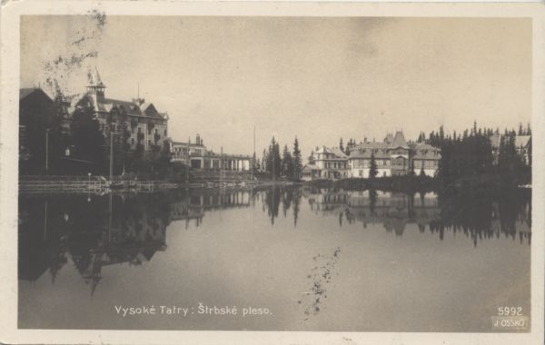 Hotele nad Szczyrbskim Jeziorem. Na dole wpisany tytuł i nazwisko fotografa.