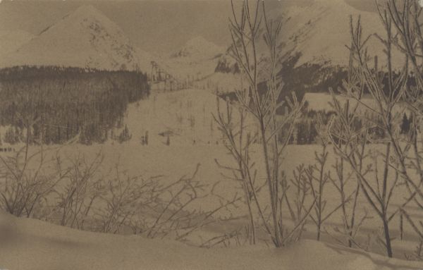 Zimowy widok znad Szczyrbskiego Jeziora na Solisko, Szczyrbski Szczyt i Skrajn± Basztę. W ¶rodku zdjęcia stara skocznia narciarska.