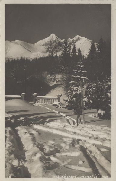 Zimowy widok na Łomnicê z Tatrzańskiej Łomnicy. Na pierwszym planie ustawione narty.