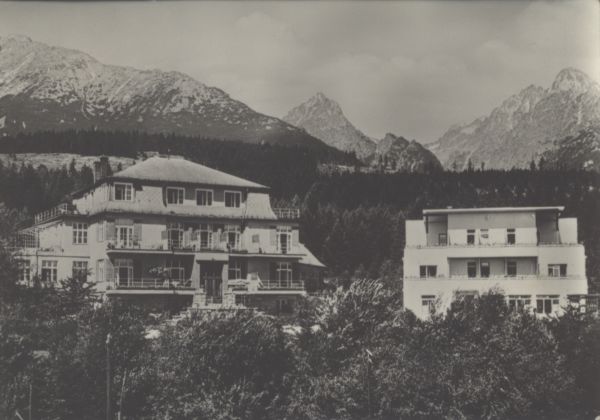 VYSOKÉ TATRY - Hornę Smokovec (950 m) Zotavovòa ROH Partizán, ubytovòa Sokol. V pozadí Slavkovskę čtít (2452 m), Prostrednę hrot (2440 m) a Lomnickę čtít (2632 m)