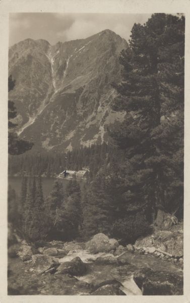 Pocztówka użyta w obiegu pocztowym, znaczek oderwany, korespondencja. Logo wydawcy. Dodatkowo pieczęć schroniska: P. P. Popradské Pleso 1513 m.