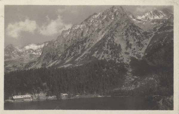 Schronisko nad Popradzkim Stawem. W tle: Wołowiec Mięguszowiecki, Kopa Popradzka.