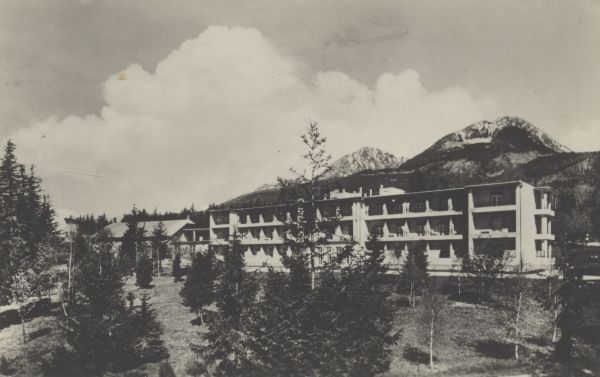 Tatrzańska Polanka. Budynek sanatorium i jego otoczenie. W tle szczyty: Tępa, Kończysta i Gerlach.