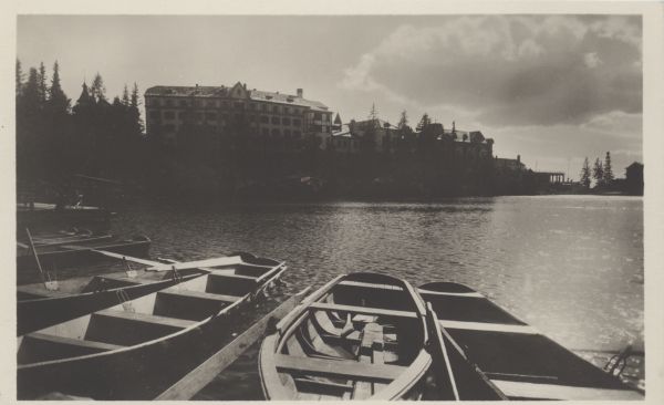 Szczyrbskie Jezioro, łódki. W tle zabudowania w Szczyrbskim Jeziorze.