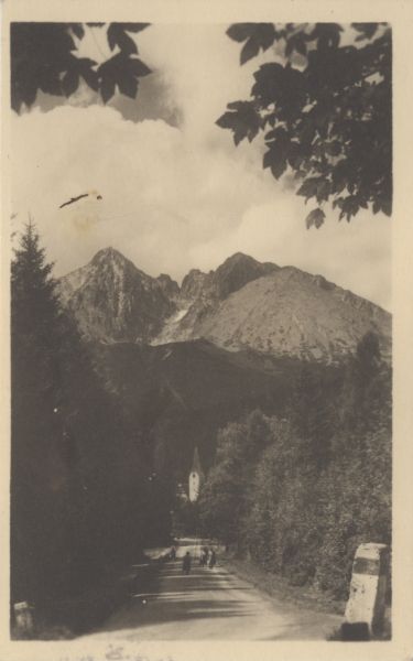 Tatrzańska Łomnica. Przy ulicy ko¶ciół ewangelicki, w tle szczyty: Łomnica, Widły i Kieżmarski Szczyt.