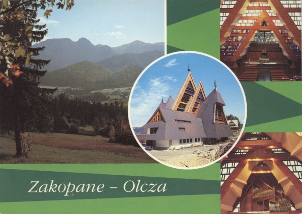Wnętrze kościoła - organy. Pod zdjęciami po lewej stronie napis Zakopane - Olcza.