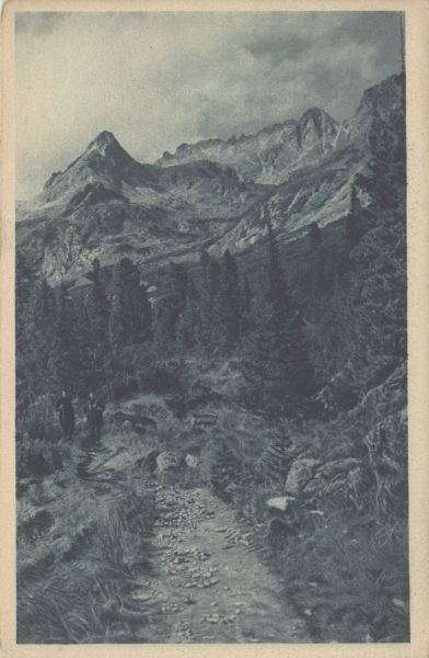 Dolina Mięguszowiecka. Widok na szlak turystyczny i idących po nim 2 turystów. W tle Wołowiec Mięguszowiecki (dawniej Szczyt Olgi), Wołowy Grzbiet i Wołowa Turnia.