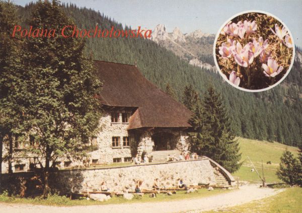 Pocztówka 2 elementowa. Główne zdjęcie przedstawia schronisko na Polanie Chochołowskiej, w tle widać Mnichy Chochołowskie. W narożniku drugie zdjęcie przedstawia krokusy (Crocus scepusiensis). W górnej części widokówki napis Polana Chochołowska.