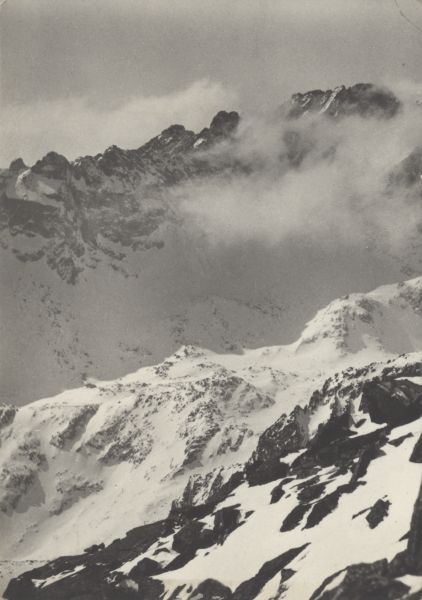 Vysoké Tatry - Veľka Studená dolina - hrebeň Slavkovských veží s Bradavicou (2476 m), vpravo v mraku Gerlachovský štít (2655 m)