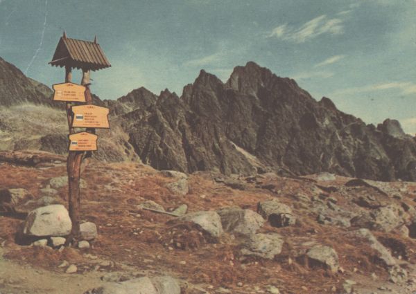 Widok z Doliny Staroleśnej na Pośrednią Grań i Żółty Szczyt. Na pierwszym planie szlak i kierunkowskaz turystyczny.