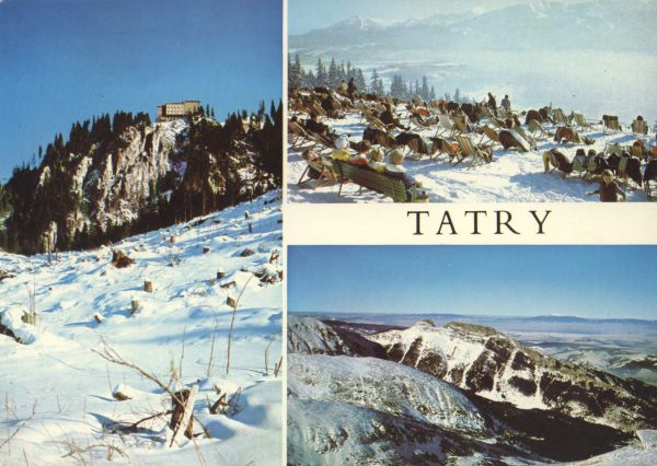 Pocztówka 3 elementowa. Zdjęcia przedstawiają: pośrednią stację kolei linowej Kuźnice - Kasprowy Wierch na Myślenickich Turniach, na pierwszym planie wiatrołom