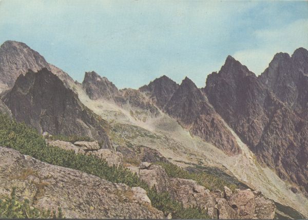 VYSOKÉ TATRY - WYSOKIE TATRY - HOHE TATRA - THE HIGH TATRAS Veľká Studená dolina. Od ľava Široká veža (2461 m), Priečne sedlo (2352 m), Priečna veža, Sokolia veža, Drobná veža, Žltá veža (2385 m), Malý hrot, Prostredný hrot (2440 m) v popredí Strelecká veža.