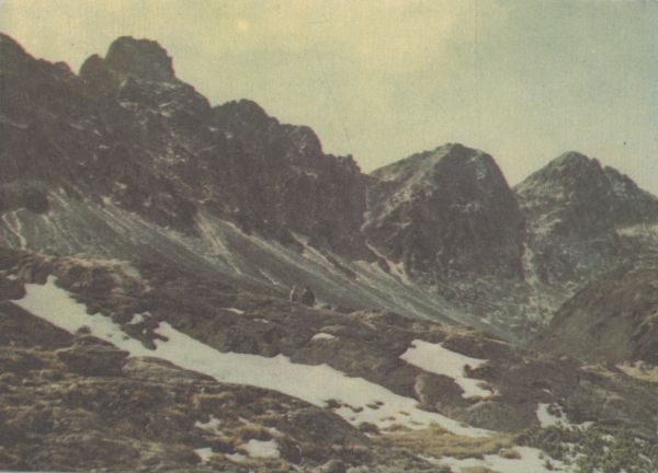 Tatrzański Park Narodowy [Słowacja] - Widok z Doliny Staroleśnej na Staroleśny Szczyt (z lewej), Zwalista Turnia, Baniasta Turnia i Mała Wysoka. Tytuł również w języku: ros., ang., niem.