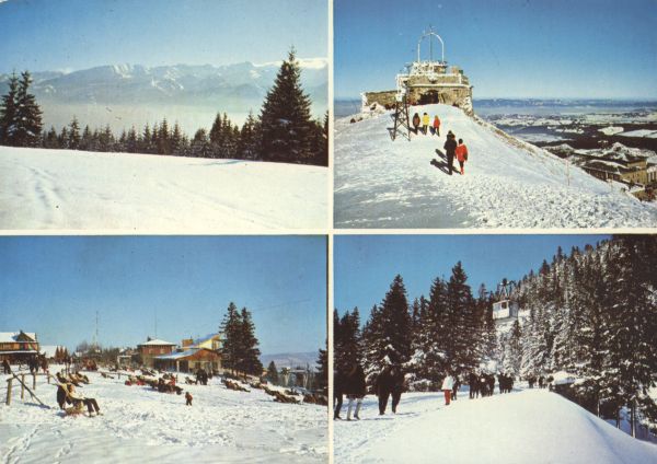 Pocztówka 4 elementowa. Fotografie w scenerii zimowej przedstawiają: widok z Gubałówki na Tatry