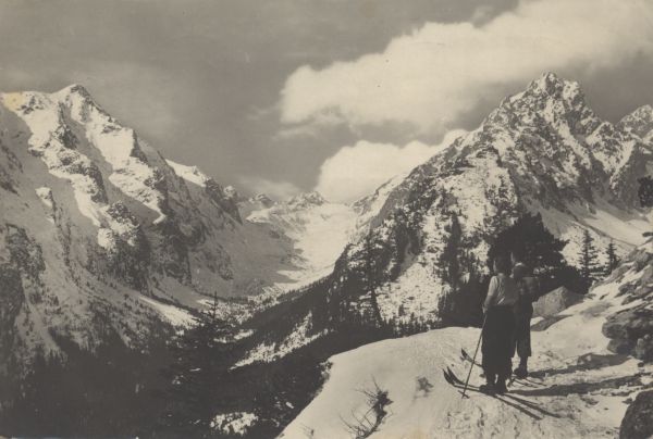 Zimowy widok z Łomnickiej Kazalnicy do Doliny Staroleśnej. Z lewej Sławkowski Szczyt, z prawej Pośrednia Grań. Na pierwszym planie 2 narciarzy.