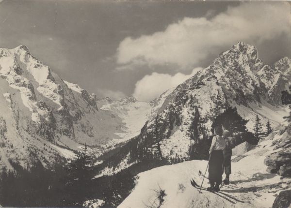 Zimowy widok z Łomnickiej Kazalnicy do Doliny Staroleśnej. Z lewej Sławkowski Szczyt, z prawej Pośrednia Grań. Na pierwszym planie 2 narciarzy.