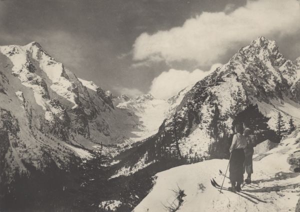 Zimowy widok z Łomnickiej Kazalnicy do Doliny Staroleśnej. Z lewej Sławkowski Szczyt, z prawej Pośrednia Grań. Na pierwszym planie 2 narciarzy.