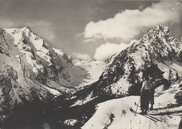 Zimowy widok z Łomnickiej Kazalnicy do Doliny Staroleśnej. Z lewej Sławkowski Szczyt, z prawej Pośrednia Grań. Na pierwszym planie 2 narciarzy.