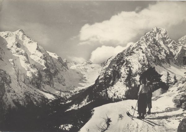 Zimowy widok z Łomnickiej Kazalnicy do Doliny Staroleśnej. Z lewej Sławkowski Szczyt, z prawej Pośrednia Grań. Na pierwszym planie 2 narciarzy.