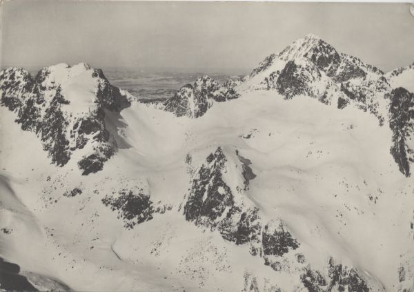 Tatry Wysokie. Widok ze Sławkowskiego Szczytu na Dolinę Starole¶n±: Jaworowy Szczyt, Ostry Szczyt i masyw Łomnicy. (Bł±d w opisie, na zdjęciu nie widać masywu Łomnicy tylko Mały Lodowy Szczyt)