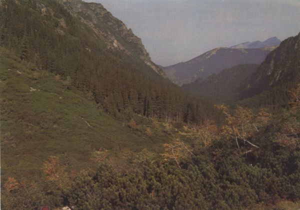 Pocztówka przedstawia górną część Doliny Roztoki (powyżej górnej granicy lasu), w tle widoczne szczyty Tatr Bielskich.