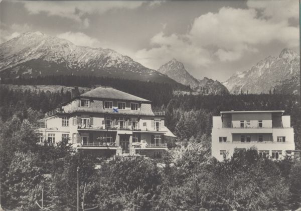 VYSOKÉ TATRY - Hornę Smokovec (1000 m) Zotavovòa ROH Partizán. V pozadí Slavkovskę čtít (2453 m), Prostrednę hrot (2440 m) a skupina Lomnického čtítu.