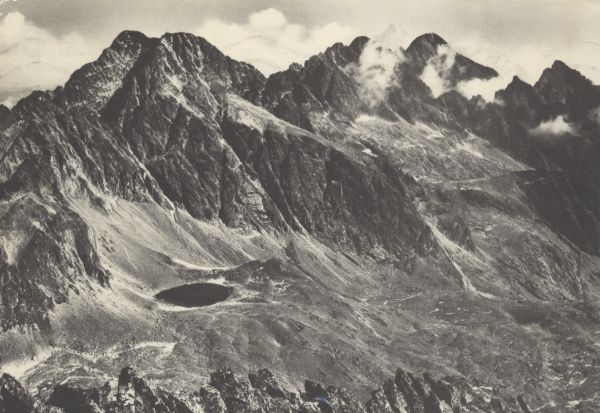Widok z Małej Wysokiej na Zmarzły Staw Starole¶ny w Dolinie Starole¶nej. W tle od lewej: Lodowy Szczyt, Lodowa Kopa, poniżej Jaworowy Szczyt, Durny Szczyt, Łomnica i Po¶rednia Grań.