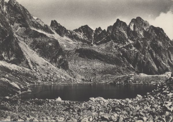 VYSOKÉ TATRY - pohľad od Zbojníckého plesa na Stredohrot, Žltú vežú, trojitú Malú vežu Sokoliu, Priečnu vežu a Priečne sedlo