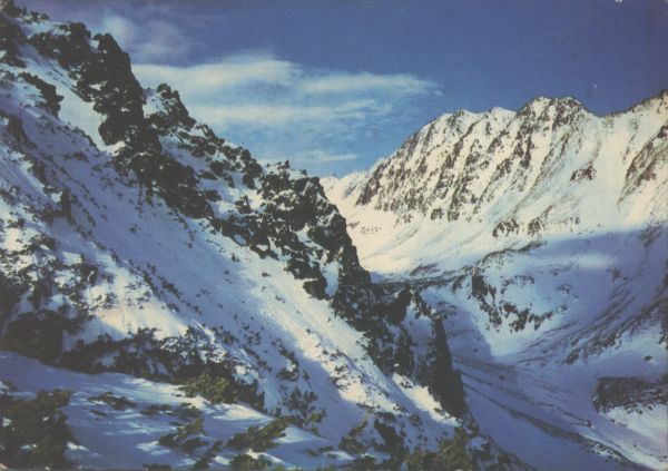 Tatry Wysokie. Widok z Soliska na Dolinę Młynicką, w tle Zadnia Baszta. Tytuł również w języku: niem., ang., fr.