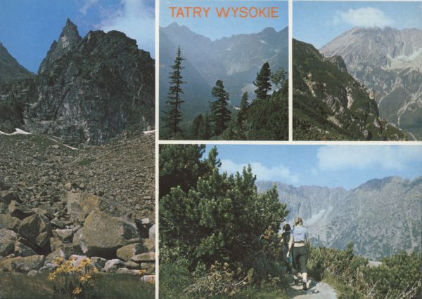 Poniżej turyści na szlaku na Świstówce - w tle otoczenie Dolinki Buczynowej od strony Buczynowych Turni. U góry na środkowym zdjęciu napis TATRY WYSOKIE.