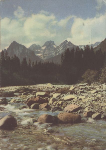 Tatrzański Park Narodowy [Słowacja]. Dolina Żabich Stawów Białczańskich. Od lewej: Młynarz, Wysoka i Niżnie Rysy. Tytuł również w języku: ros., ang., niem.