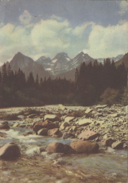 Tatry Wysokie. Dolina Żabich Stawów Białczańskich. Od lewej: Młynarz, Wysoka i Niżnie Rysy. Tytuł również w jęz.: ros., ang., niem.