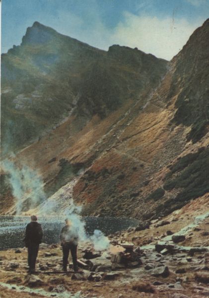 Dwoje ludzi nad Czarnym Stawem G±sienicowym gotuje na prymitywnej kuchni polowej. W tle Ko¶cielec i szlak na Karb.