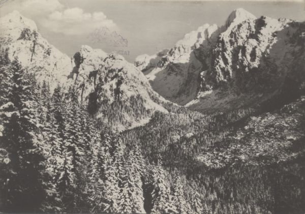 Widok z Siodełka na Dolinę Małej Zimnej Wody w zimie. Z lewej Rywociny i Pośrednia Grań. Z prawej Łomnica.