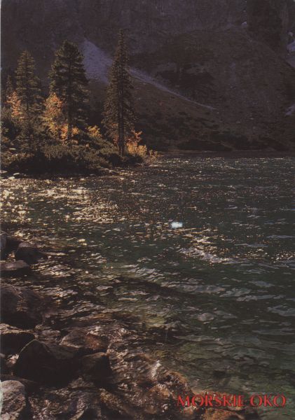 Pocztówka przedstawia widok na Morskie Oko, w tle Wielki Piarg pod Mięguszowieckimi Szczytami. Nad brzegiem rosną świerki (Picea abies) i limba (Pinus cembra). Na dole po prawej stronie napis MORSKIE OKO.
