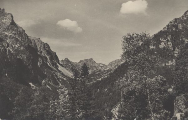 Widok z Doliny Starole¶nej. Stoki Łomnicy, Dzika Turnia i ¦wistowy Szczyt. Na pierwszym planie drzewa.