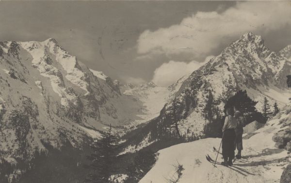 Zimowy widok z Łomnickiej Kazalnicy do Doliny Staroleśnej. Z lewej Sławkowski Szczyt, z prawej Pośrednia Grań. Na pierwszym planie 2 narciarzy.