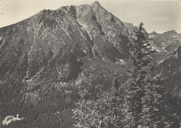 Tatry Wysokie. Widok z magistrali: schronisko Kozica w Dolinie Starole¶nej. W tle Sławkowski Szczyt, Dzika Turnia i ¦wistowy Szczyt.
