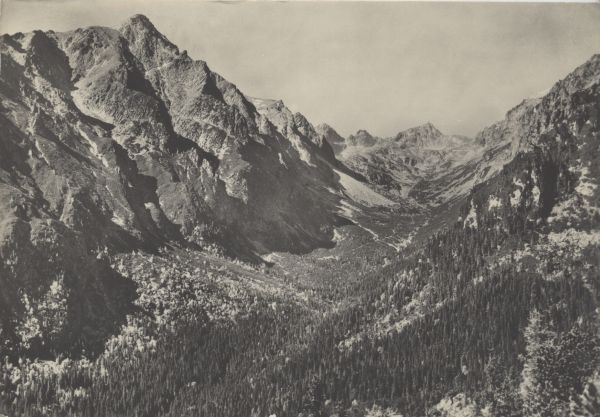 Widok na Dolinę Staroleśną. Z lewej masyw Sławkowskiego Szczytu. Najwyższy wierzchołek to Staroleśny Szczyt. W tle Mała Wysoka, Rohatka, Dzika Turnia i Świstowy Szczyt. Na prawo stoki Pośredniej Grani. Na pierwszym planie las.