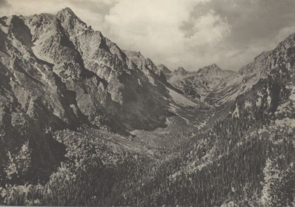 Widok na Dolinę Starole¶n±. Z lewej masyw Sławkowskiego Szczytu. Najwyższy wierzchołek to Starole¶ny Szczyt. W tle Mała Wysoka, Rohatka, Dzika Turnia i ¦wistowy Szczyt. Na prawo stoki Po¶redniej Grani. Na pierwszym planie las.
