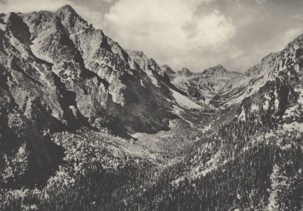 Tatrzański Park Narodowy [Słowacja]. Dolina Starole¶na. Z lewej Sławkowski Szczyt. W tle Mała Wysoka, Rohatka, Dzika Turnia i ¦wistowy Szczyt.