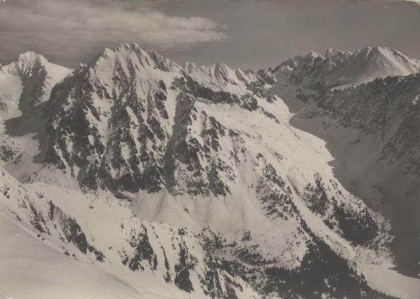 Widok ze Skrajnej Baszty na Dolinę Mięguszowiecką i Dolinę Złomisk w zimowej scenerii. Od lewej szczyty: Rysy, Wysoka i Kończysta. W tle Gerlach.