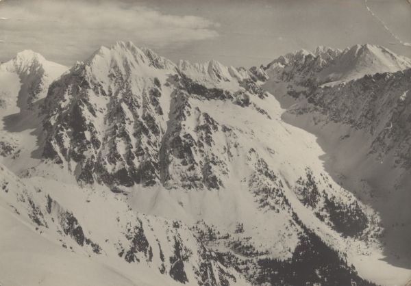 Widok ze Skrajnej Baszty na Dolinę Mięguszowiecką i Dolinę Złomisk w zimowej scenerii. Od lewej szczyty: Rysy, Wysoka i Kończysta. W tle Gerlach.